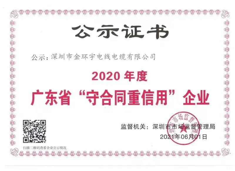 金環(huán)宇榮獲2020年度“廣東省守合同重信用企業(yè)”稱號